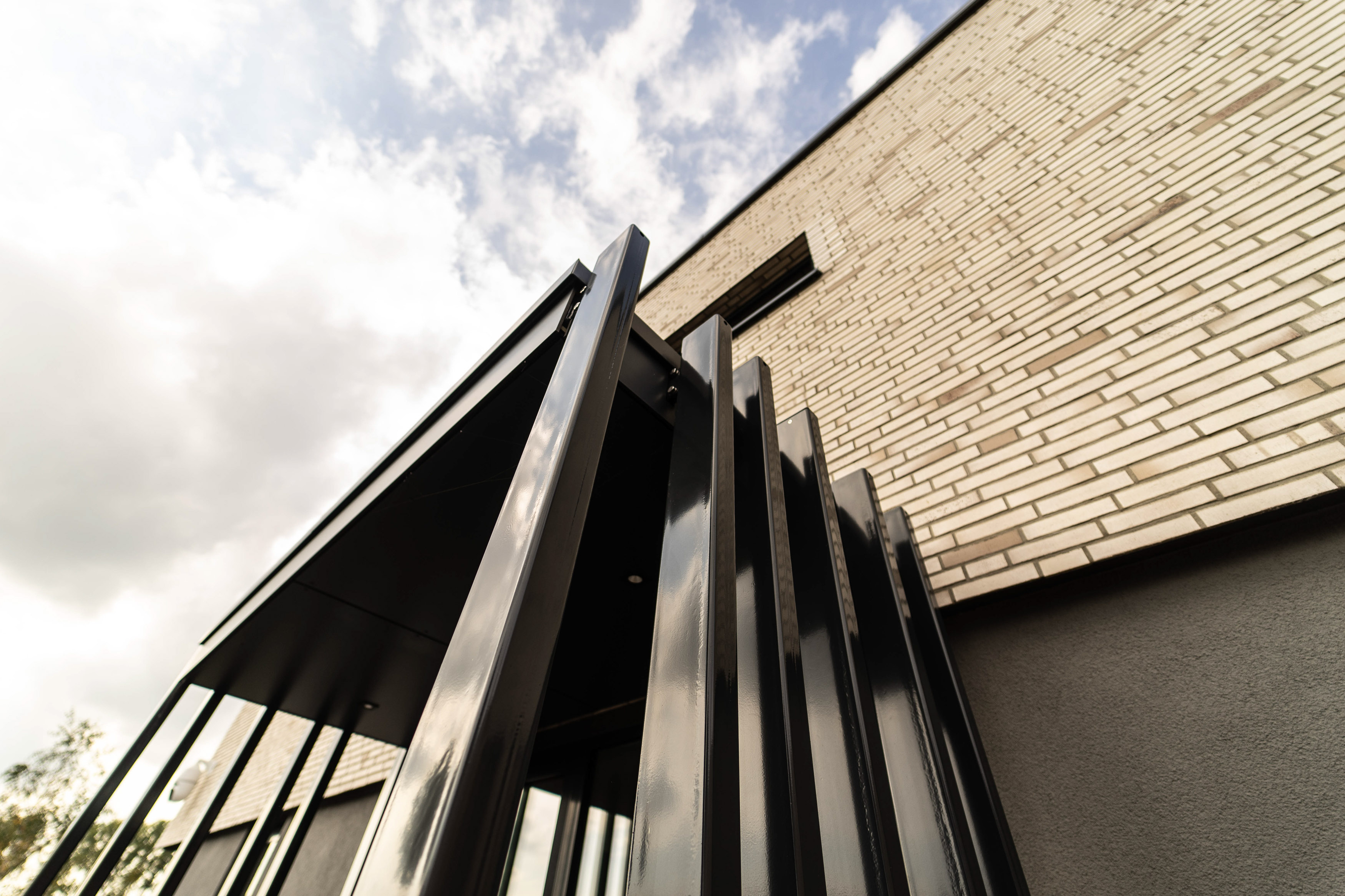Die Verbindung eines repräsentativen Firmensitzes mit qualitativen Wohnen unter einem Dach, der Wunsch nach einem nachhaltigen Gebäude und der Möglichkeit, erweitern zu können, sowie hochwertige Arbeitsplätze für die Mitarbeiter setzten die komplexen Rahmenbedingen für das neue Wohn- & Geschäftshaus der SSG-Sicherheitstechnik GmbH & Co.KG. Das im Spannungsfeld zwischen Grünraum und Gewerbegebiet gelegene Grundstück bietet die optimale Vorrausetzungen um die unterschiedlichen Nutzungen zusammen zu verwirklichen. So öffnet sich der private Wohnbereich in den unverbauten nordöstlichen Grünraum, während der Geschäftsbereich als östliches Entre das Gewerbegebiet markiert. Neben- und Hauptgebäude bilden erdgeschossig Riegel und Wandscheiben aus welche von einem Körper überspannt werden. Hier befinden sich Büros, Besprechungs- und Sozialbereiche. Darunter öffnet sich der repräsentative Empfang und der Werkstattbereich zum vorgelagerten Hof.